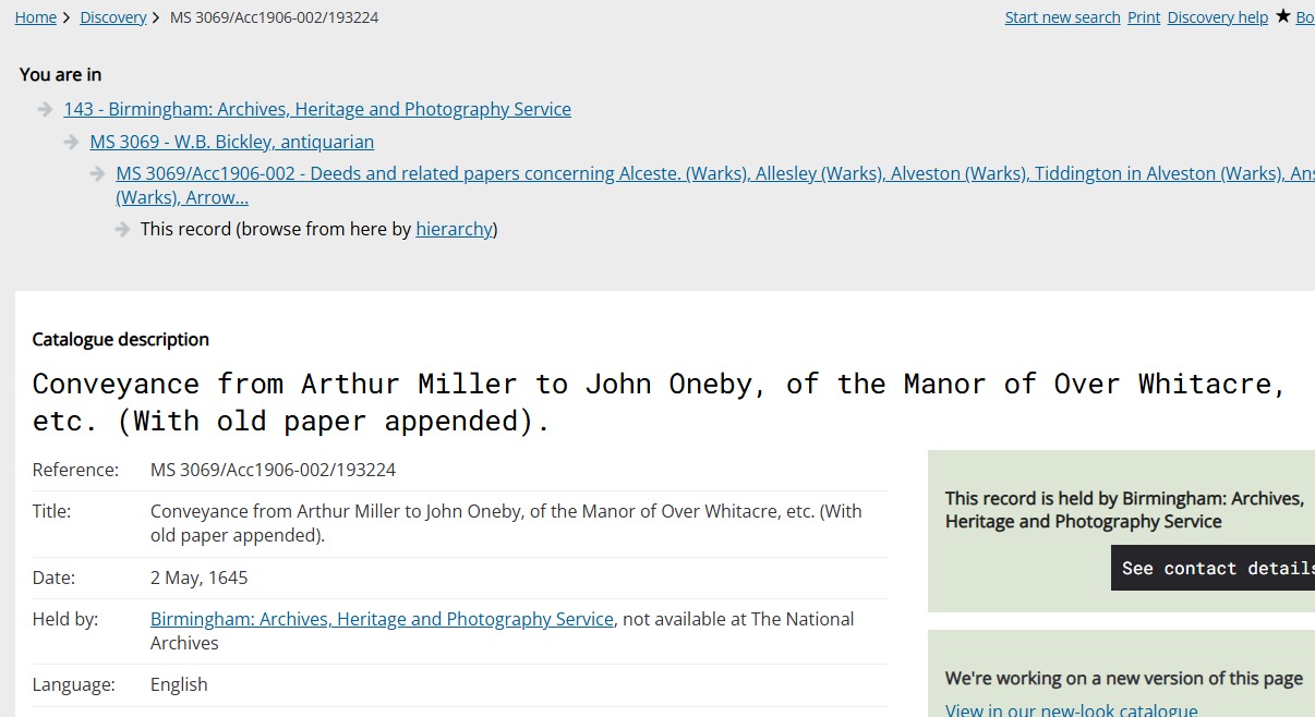in the parish of Over Whiteacre in the Hundred of Coleshill